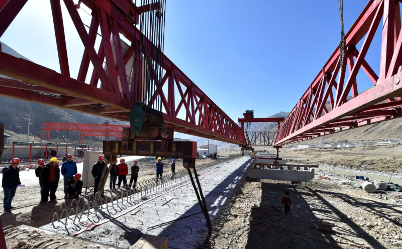 2018年4月22日,工作人员在拉萨至那曲高等级公路昂嘎大桥施工现场作业。当日,由中铁大桥局承建的拉萨至那曲高等级公路昂嘎大桥架设第一梁。昂嘎大桥全长246米,位于拉萨市羊八井峡谷,海拔高、地质条件复杂,是拉萨至那曲高等级公路重要控制性工程。