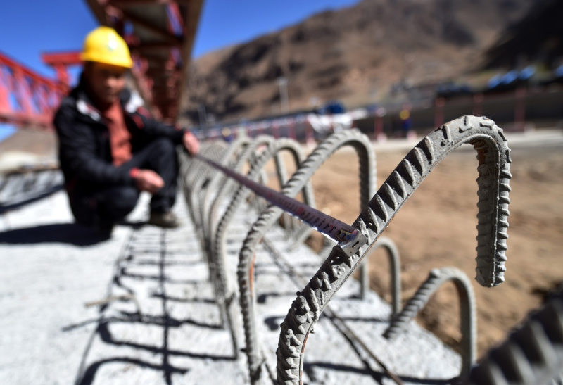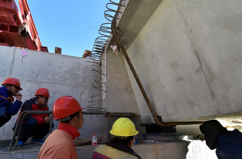 2018年4月22日,工作人员在拉萨至那曲高等级公路昂嘎大桥施工现场检查梁与桥墩的结合部。