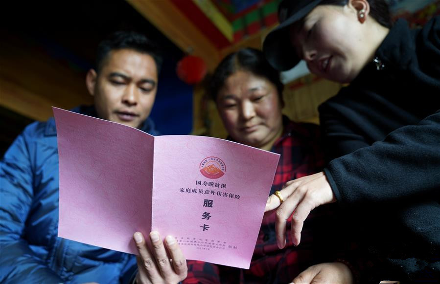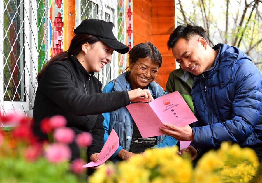 2018年5月5日,广东省第八批援藏工作队波密工作组成员(右)为贫困户投保人(中)讲解“脱贫保”家庭成员意外伤害保险内容。近日,广东省第八批援藏工作队波密工作组出资为西藏自治区波密县1075户建档立卡贫困户和边缘贫困户购买中国人寿“脱贫保”家庭成员意外伤害保险。