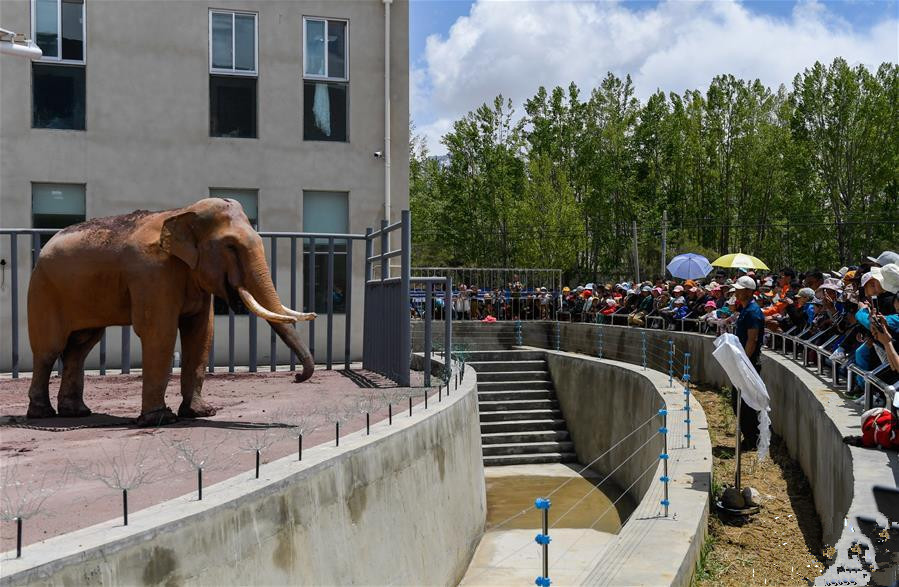 2018年5月1日,游人在拉萨曲水动物园大象馆观赏游玩。 当日,西藏拉萨曲水动物园正式开园。曲水动物园位于拉萨市曲水县曲水镇,园内除有高原动物及附近村民救助的野生动物外,还从内地引进了大象、骆驼、孔雀等动物,目前总共有30多种动物可供游客观赏。