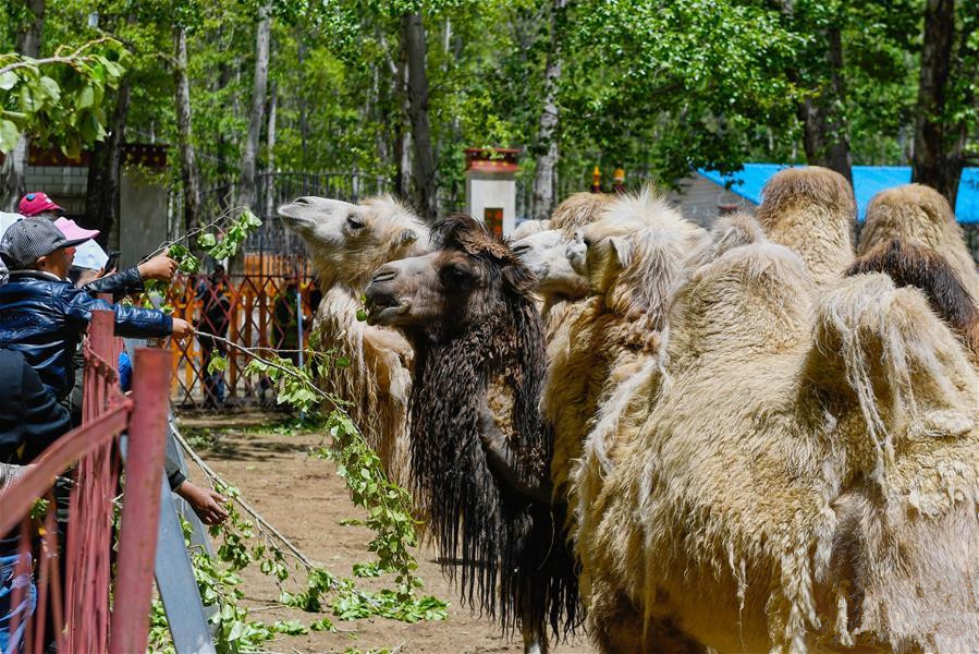 5月1日,游人在拉萨曲水动物园内观赏骆驼。