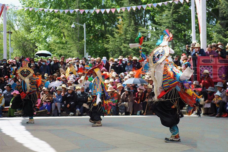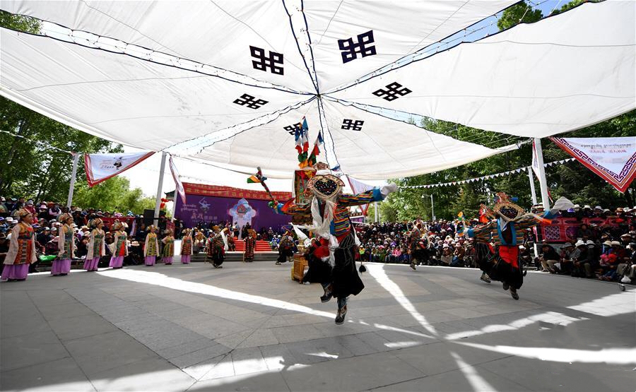 2018年5月12日,藏戏演出季活动在西藏拉萨启幕。据介绍,自当日起至9月的每周六,民间藏戏艺人将在龙王潭公园进行公益表演。图为藏戏艺人在拉萨市龙王潭公园表演藏戏。